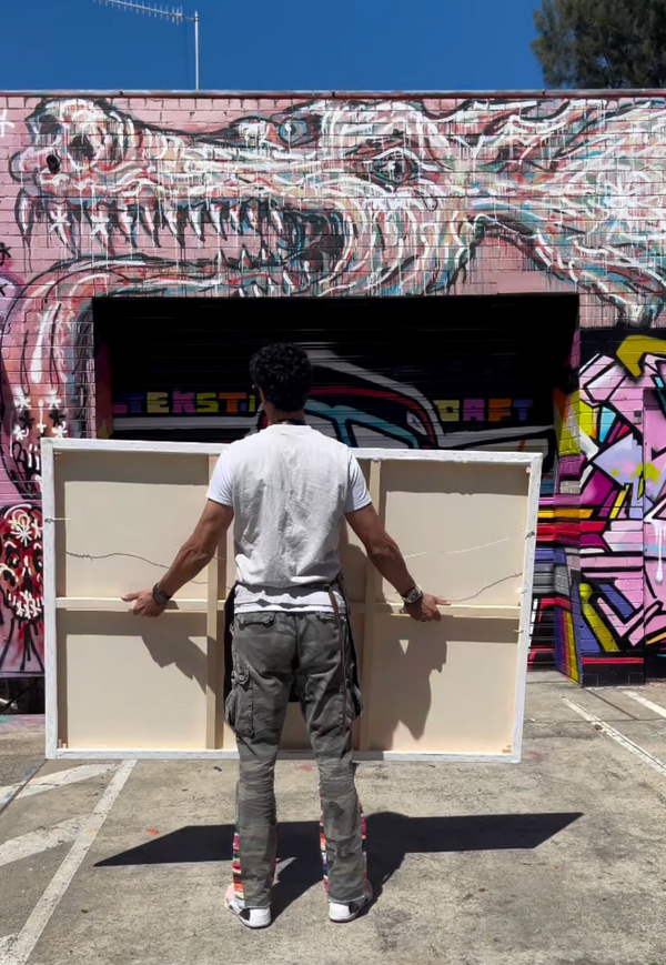Acrylic paint, spray paint and UV pigment on a double thick canvas Premium.