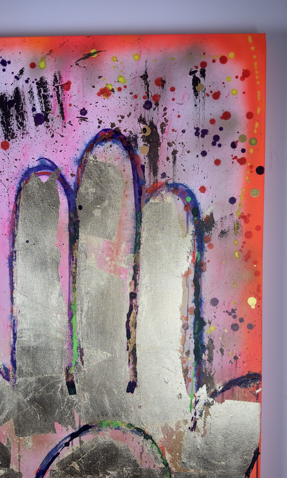 Acrylic paint, spray paint and UV pigment on a double thick canvas Premium.